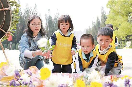 ■清明至,市民通过形式多样的活动祭奠英烈,传承红色基因,培育爱国情怀。图为4月3日,幼儿园小朋友在老师的带领下在广州起义纪念碑前向革命先烈献花。新华社发