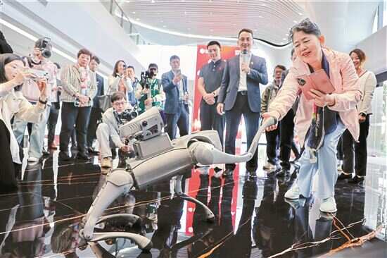 ■外资企业广东行考察团成员与机器狗握手互动。
