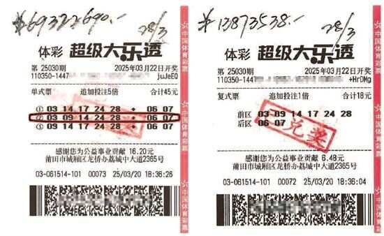 让陈先生收获大奖的是一张5倍投的追加单式票和一张1倍投的追加复式票,其中5倍单式票中得6932.26万元,1倍复式票中得1387.35万元。刘先生在缴纳个人所得税1663.92万元后,收获了6655.69万元的税后奖金。