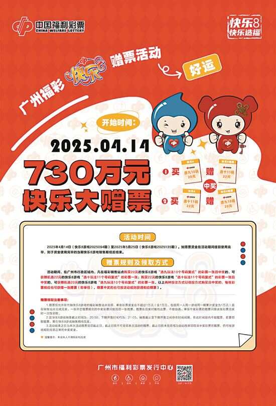 新快报讯 记者陆妍思 通讯员郭新庆 盘芷滢报道 记者从广州市福彩中心获悉,为真情回馈长期以来彩民朋友对福利彩票事业的关心和支持,广州市福利彩票发行中心将自2025年4月14日起,在全市范围内开展“快乐8快乐大赠票”促销活动,本次活动共安排赠票资金730万元,针对快乐8游戏两种玩法开展赠票。