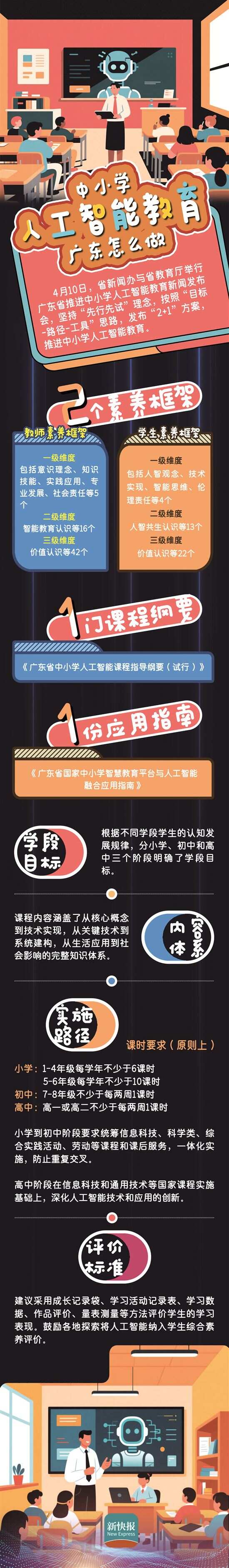 会议指出,广东省坚持“先行先试”理念,集中组织高校人工智能教育专家、中小学信息科技骨干教师协同研制了广东推进中小学人工智能教育落地的“2素养1纲要”方案(下称“2+1”方案),分别是“两大素养框架”,即《广东省中小学教师人工智能素养框架(试行)》《广东省中小学学生人工智能素养框架(试行)》(统一简称为“《师生素养框架》”),“1”个课程纲要——《广东省中小学人工智能课程指导纲要(试行)》。“2+1”方案从课程设置、教学资源、师资建设、培养目标等方面,对中小学人工智能教育提出具体要求,为各地、各中小学校开展人工智能通识教育、基于国家平台整合人工智能进行教学创新,开展师生人工智能素养评价提供参考。