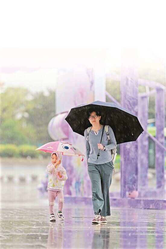 ■受强对流天气影响,广州市南沙区12日下午迎来强降水,市民们在雨中撑伞出行。