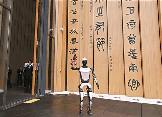 ■人形机器人在中国馆外向嘉宾招手致意。