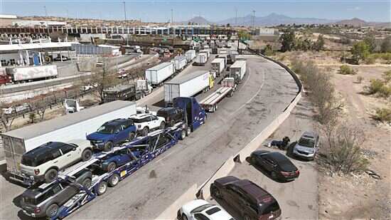 这是4月2日在墨西哥索诺拉州诺加莱斯市,一辆装载多辆汽车的运输车(下中)行驶在墨美边境附近的公路上(无人机拍摄)。