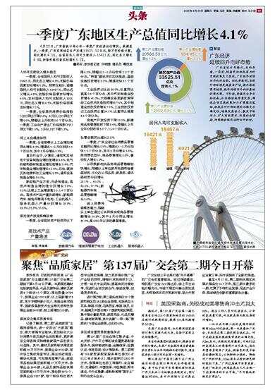 4月22日,广东省统计局公布一季度广东经济运行简况。数据显示,一季度,广东实现地区生产总值33525.51亿元,按不变价格计算,同比增长4.1%。全省居民人均可支配收入15421元,同比名义增长4.8%,扣除价格因素实际增长5.2%。