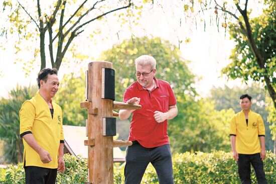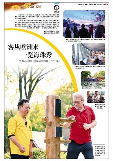 ■在海珠湿地,非遗传人现场表演咏春拳,客商们纷纷上手梅花桩,称要和师傅学几招中国功夫。