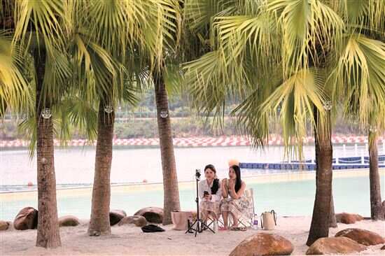 ■森林海旅游度假区,两名主播以湖为背景直播。