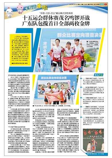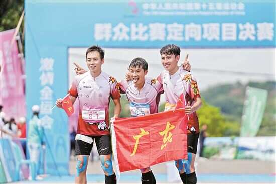 5月8日,第十五届全国运动会群众赛事活动拉开大幕,在定向决赛首日的较量中,广东队包揽了全部两枚金牌。首先,由唐建达、唐潇、李卓业、陈鑫(替补)组成的广东男子定向接力队,以1小时43分19秒折桂,帮助广东代表团摘得十五运会群众赛事活动的首金。随后,由陈淑娜、叶琦、郑嘉怡、曹丹萍(替补)组成的广东女子定向接力队以2小时24分29秒登顶。