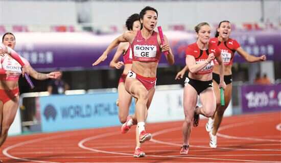 ■5月11日,在广州天河体育中心举行的2025年世界田联接力赛女子4×100米接力资格赛第二轮比赛中,中国队位列小组第一,获得东京世锦赛参赛资格。图为中国队第四棒选手葛曼棋(前)在比赛中。新华社发