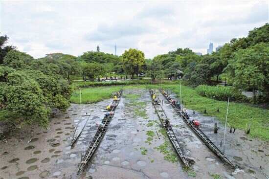 ■5月16日清晨,广州海珠湿地公园的龙吟潭边锣鼓喧天、鞭炮齐鸣,龙潭村的村民们以传统“起龙”仪式唤醒沉睡近一年的龙船,为即将到来的端午节龙舟活动做准备。新快报记者 郭思杰/摄