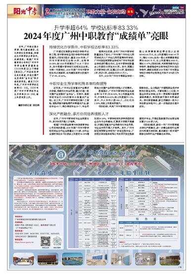 近年,广州通过整合资源、强化基础建设、优化师资队伍等措施,持续优化中职学校办学条件,成绩亮眼。根据广州市教育局公布的《广州市中等职业教育质量报告(2024年度)》(以下简称《报告》),广州在拓宽学生成长通道、打造支撑产业发展的“金专业”等方面成效明显。截至2024年底,广州市中职学校达标率83.33%。2024年度广州市中职学校毕业生升学率为64.68%,较上年度有所上升。