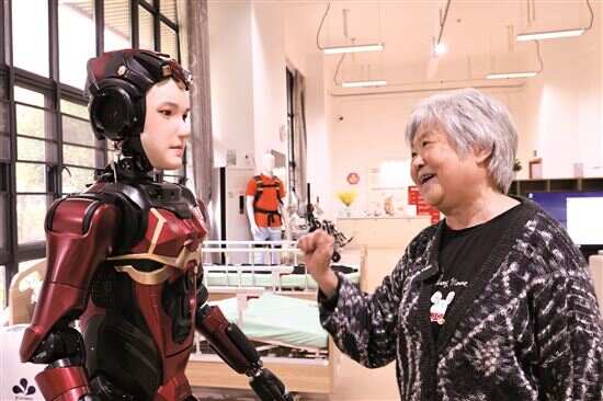 3月3日,在深圳市养老护理院,一名老人与人形机器人“夏澜”互动。