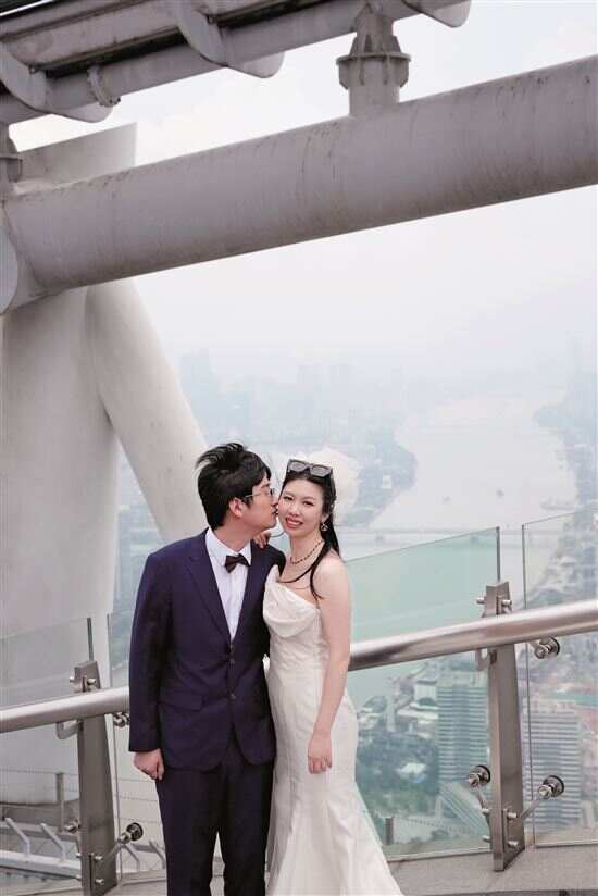5月20日上午10时许,多对新人身着精心挑选的婚服,执手登上全国最高结婚登记户外颁证点——广州塔450米户外观景平台。新人们以城市天际线为背景,在亲友的祝福下,行却扇礼、共饮合卺酒、许下一生承诺。