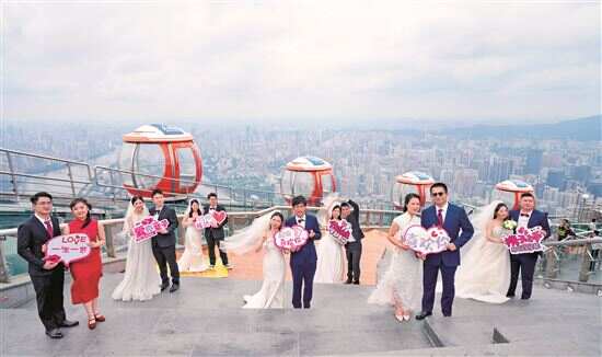 ■5月20日,新人们在广州塔450米观光平台上拍照打卡。