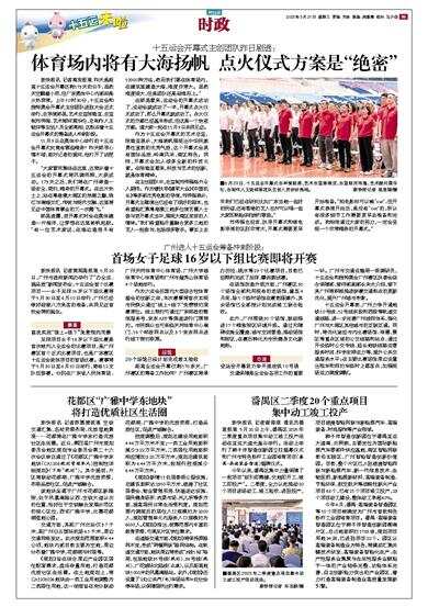 “大家冒雨集结在这里,这预示着十五运会的开幕式将风调雨顺,大获成功。173天之后,我们将在广州缔造一场安全、简约、精彩的开幕式。在这片热土上,站在粤港澳大湾区的浪潮之巅,珠江与南海交汇,传统与现代交融,这里将见证中国体育事业的又一次腾飞。”