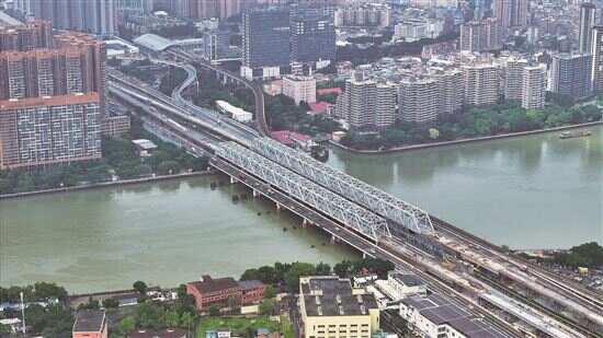 广湛高铁利用广茂铁路通道引入广州枢纽,在珠江之上开启了新旧桥梁的融合之旅。新建珠江四线特大桥遵循“拆东保西、拆一建三”的设计原则,延续广茂铁路“双桥烟雨”风貌,升级改造东桥,原位保护西桥,将曾经的双线普速桥建设成四线高速铁路桥。