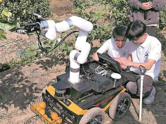 ■中山职业技术学院 “智必达”团队成员操作智能采摘机器人。