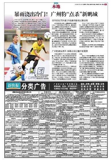 不过,广州的“龙舟水”帮了广州豹的忙。本场比赛17时开球后,恰逢大雨,场地迅速积水,新鹏城的传控特点被完全限制住,坚决采用长传冲吊战术的广州豹反而占了上风。上半场的首尾两端,广州豹用一模一样的左路45°传中两次砸开新鹏城球门。