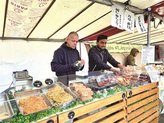 ■图中孟加拉国小哥售卖的是各种韩式风味的炸鸡、煎饼及各种泡菜,很受欢迎。