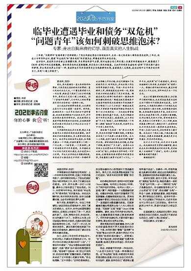 非常感谢你的持续信任和来信!上一次你向我求助的时候,还是三年前的高考前夕,当时抑郁的你陷入了轻生的疯狂想法与封闭泡沫之中,丧失了对真实生活的感受。当年,我平生第一次打110报警,最终合力助你度过了轻生危机。如今,你即将专科毕业,再次面临“毕业危机”和“债务危机”的双重夹击。你在此关键时刻,再次向我来信求助,给你主动暴露问题、主动寻求帮助的勇气点赞!