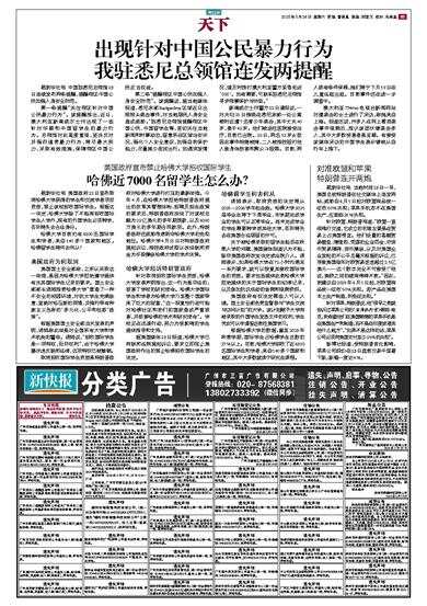第一条提醒“关注领区针对中国公民暴力行为”。该提醒指出,近日,澳大利亚新南威尔士州出现了一些针对华裔和中国留学生的暴力行为。总领馆对此高度重视,坚决反对并强烈谴责暴力行为,将尽最大努力,采取有效措施,保障领区中国公民正当权益。