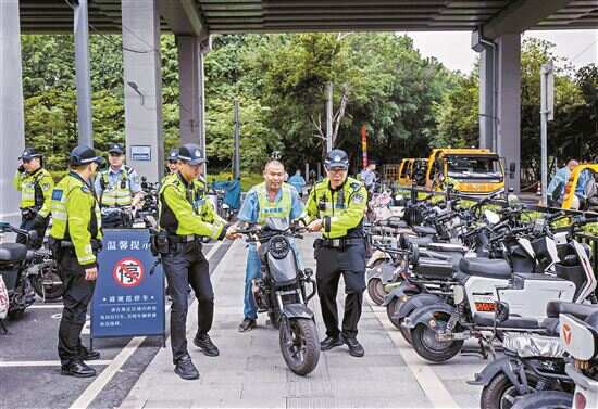 ■5月26日,在黄村地铁站附近,广州交警对违法电动自行车实施拖移。 新快报记者 观显锋/摄