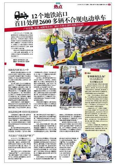 5月26日上午,广州交警、交通、城管等多部门及属地政府在全市重点地铁站口周边正式开展交通环境联合整治行动。尽管各部门提前3天就四处张贴了电动自行车须按规定悬挂号牌的“温馨提示”,但在整治行动的首日,交警在12个重点地铁站口的停车场进行全方位的验扫后,查扣、拖移2600多辆不合规车辆。
