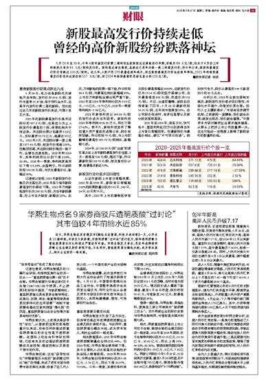 记者统计发现,2021年新股发行价触及历史高位后,2022年至今每年新股最高发行价都在下降。2022年万润新能发行价为299.88元/股,为当年新股最高,但上市当天破发,跌幅近28%。此后,万润新能的股票一路下挫,昨日收报36.9元/股,与最高位相比跌幅超85%。上市后万润新能业绩出现严重下跌,2022年至2024年净利润分别为9.59亿元、-15亿元、-8.70亿元,2025年一季度净利润为-1.56亿元。