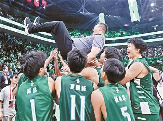 ■省实球员赛后抛起助理教练陈端(上)庆祝。新华社发