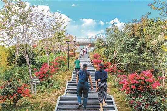 值得一提的是,踏上位于“丁彭黄”片区的马腰岭山体公园,沿着步梯而上,一路绿树繁花相间,走上观景台,山下全景尽收眼底:完整的古村落错落有致,一幅绝美的“山水新天地”画卷徐徐展开,浪漫至极。“休息时间,带我家狗狗出门呼吸新鲜空气。这里很适合散步,风景不错,还有特色建筑,好惬意。”游客吴小姐说。