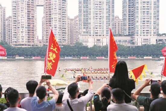 两岸观看龙舟赛的观众喝彩如潮,手机镜头纷纷对准水上比赛。