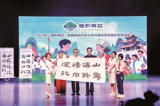 2025年“粤黔青芯”东西部协作青少年科普研学交流示范性活动在快板节目——《广黔携手耀新程》中拉开帷幕,以传统艺术形式全面展示了广州在产业、人才、劳务、消费、社会等方面开展东西部协作的工作成效;通过共同拼装象征两省友谊的“山海拼图”、共同书写“山海情深 粤黔同行”书法作品,展现广州与贵州同饮一江水、共筑一段路,从脱贫攻坚到东西部协作历时十三载的山海之情;民族歌舞《粤绣悦美》、粤曲《彩云追月》、民族舞蹈《玉鸟》等节目分别展现了底蕴深厚的岭南文化和丰富多彩的贵州民族文化。