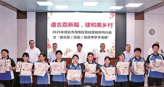 新快报讯 记者朱清海报道 “用荔枝树枝做的笔,特别精美。”“双肩包很实用,就像高考分数一样,越装越多。”近日,茂名市第四中学高三学生收到了来自茂南区的“爱的古荔(鼓励)”。当天,2025年茂名市茂南区荔枝营销系列行动之“送古荔(鼓励)给高考学子活动”在茂名市第四中学举行。活动以“古荔鼓励,金榜题名”为主题,以满载祝福的荔枝文创产品礼盒为高考学子加油鼓劲,擦亮茂南古荔品牌。