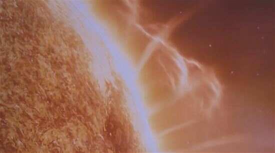 伴随耀斑的发生还出现了日冕物质抛射,太阳大气层中的等离子体高速飞出,形成一个近似球面的“冲击波”,向着太阳系传播。