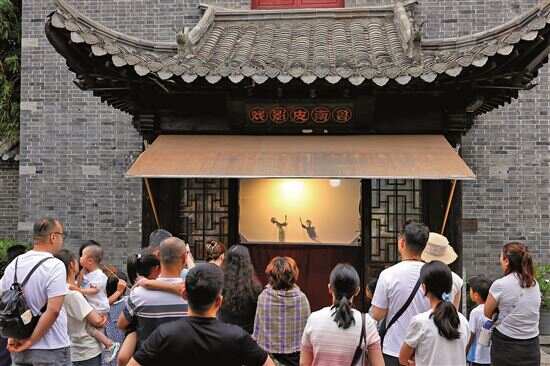 ▲游客在京杭大运河畔的山东省枣庄市台儿庄古城观看“鲁南皮影戏”。
