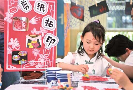 ■山西省太原市迎泽区师苑幼儿园的小朋友在庆祝“六一”主题活动中体验剪纸拓印。