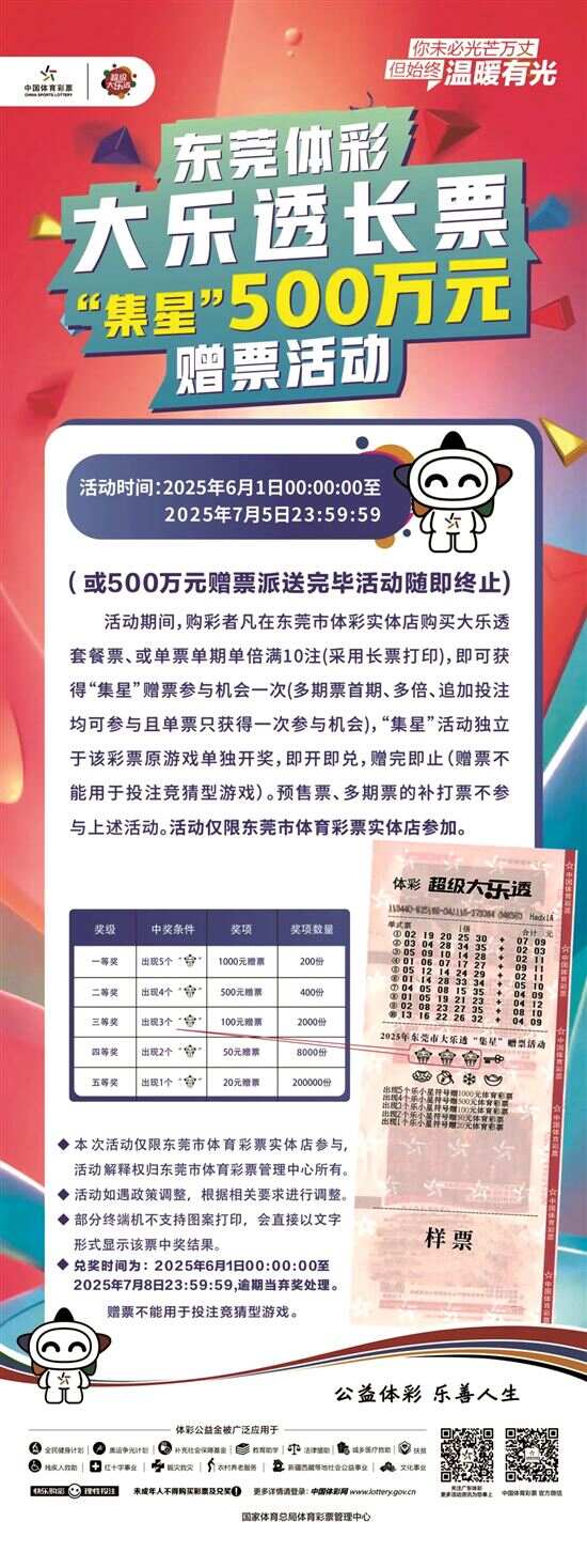 2025年6月1日至7月5日期间,东莞体彩推出体彩大乐透500万元长票“集星”赠票活动。本次活动自2025年6月1日00:00:00起至2025年7月5日23:59:59结束,若活动期间累计应赠票金额达到500万元,则活动提前结束。