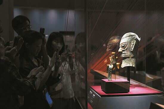 ■6月2日,在北京大运河博物馆的“看·见殷商”展,游客参观展出的出土于四川广汉三星堆遗址的戴金面罩青铜人头像。新华社发