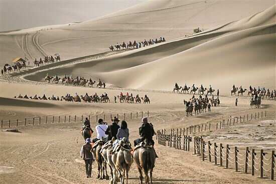 ■6月2日,游客在甘肃省敦煌市鸣沙山月牙泉景区游览。新华社发