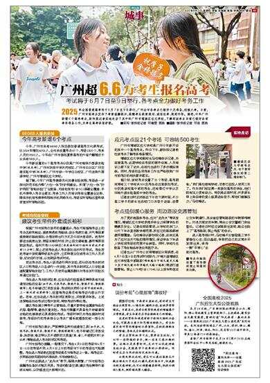 今年,广州市共有66068人报名参加普通高考文化课考试,比2024年增加6053人,全市共设置考点67个,考场2320个,考务人员约9500人。今年在广州市参加夏季高考的外省户籍随迁子女共有5402人。