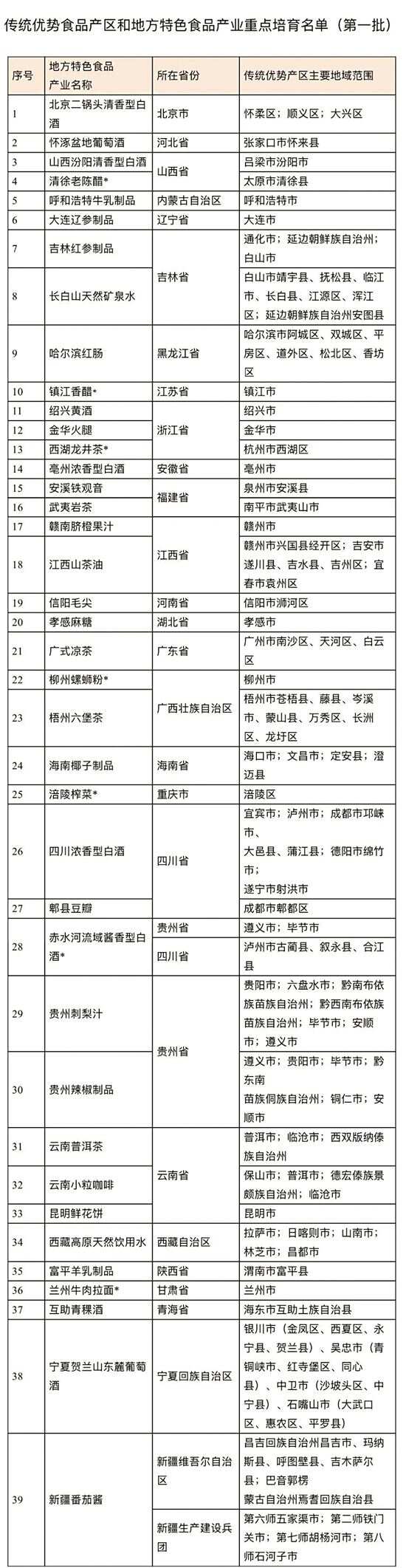 4日,我国发布首批传统优势食品产区和地方特色食品产业重点培育名单(见下表),包括云南小粒咖啡、西湖龙井茶等39个重点培育对象。