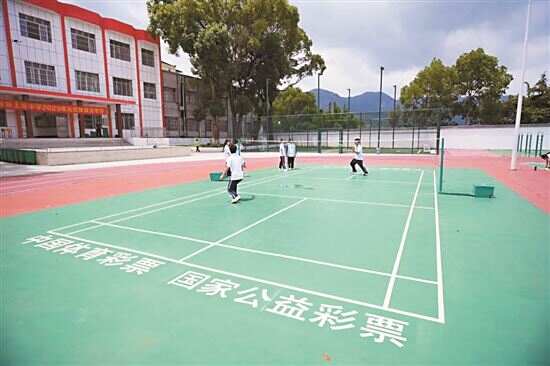 近日,上莞中学九年级学生陈嘉兴与同学们在运动场乒乓球桌上惬意挥拍。运动场上,“中国体育彩票”“公益体彩 乐善人生”等标识格外显眼。