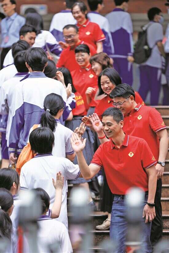 ■老师与考生一一击掌,加油打气。新快报记者 观显锋/摄(资料图)