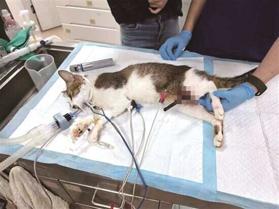 经初步诊断,该流浪猫存在外伤、左后肢胫骨骨干斜骨折。