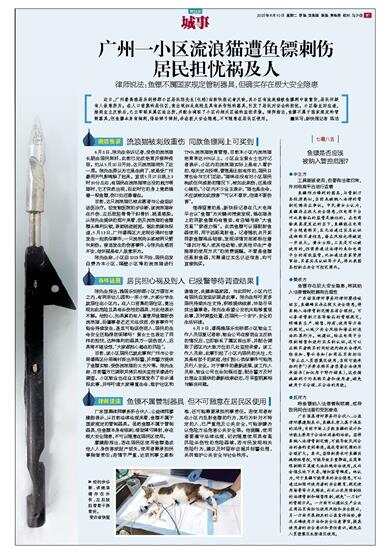 近日,广州番禺雅居乐剑桥郡小区居民陈先生(化姓)向新快报记者反映,其小区有流浪猫被鱼镖刺中致重伤,居民怀疑有人故意所为。在人口密集的居住区,竟出现如此危险且具有杀伤性的器具,引发了居民对安全的担忧。小区物业回应道,接到业主反映后,已立即联系属区派出所,并配合调取了小区内相关区域的监控录像。律师指出,鱼镖不属于国家规定的管制器具,但鱼镖本身有倒刺,借助弹弓弹射,存在极大安全隐患,不可随意在居民区使用。