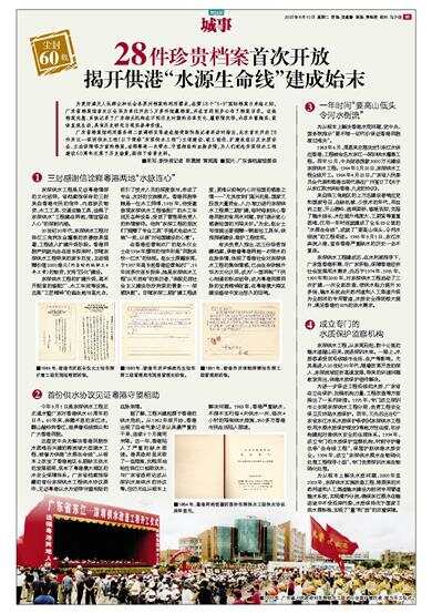 广东省档案馆利用服务部二级调研员张凌在接受新快报记者采访时指出,此次首次开放28件东江—深圳供水工程(以下简称“东深供水工程”)立项建设、竣工验收、扩建改造以及水质安全、立法保障等方面的档案,诠释粤港一衣带水、守望相助的血脉亲情,为人们纪念东深供水工程建设60周年还原了历史场景,提供了珍贵史料。