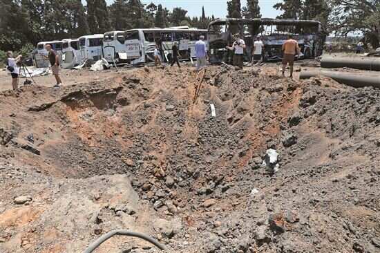 ■6月17日,在以色列中部城市海尔兹利亚,人们查看导弹袭击留下的弹坑。