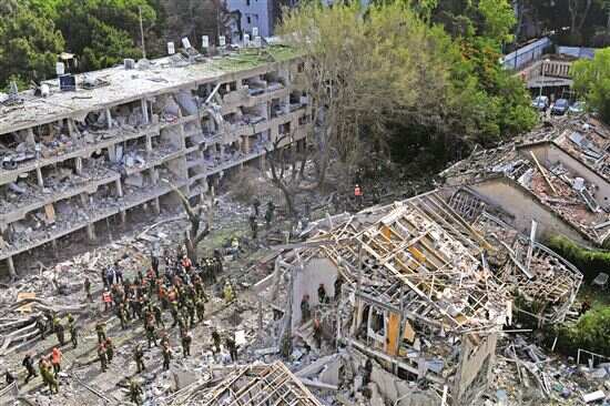 ■6月22日,在以色列中部特拉维夫的导弹袭击现场,应急和救援人员开展工作。新华社发
