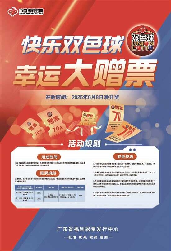 为回馈广大购彩者,广东省福利彩票发行中心自2025年6月8日起,在全省范围内(不含深圳市)开展“快乐双色球 幸运大赠票”4800万元营销活动。