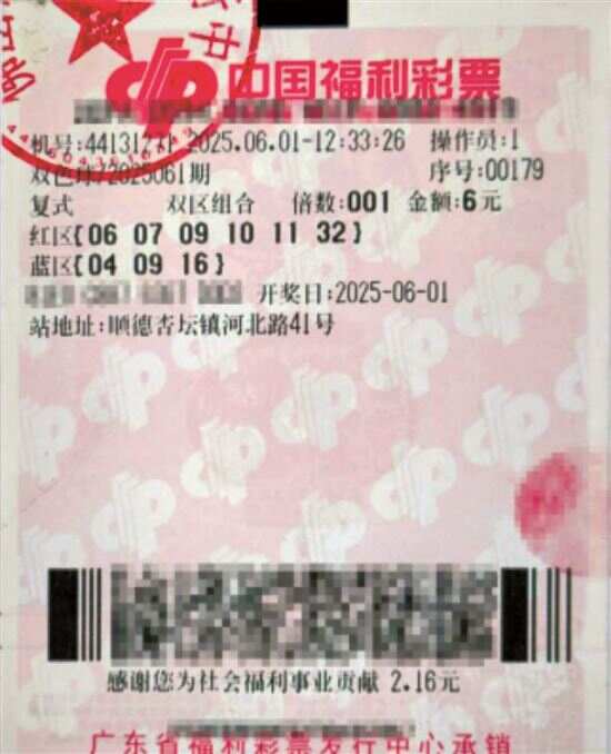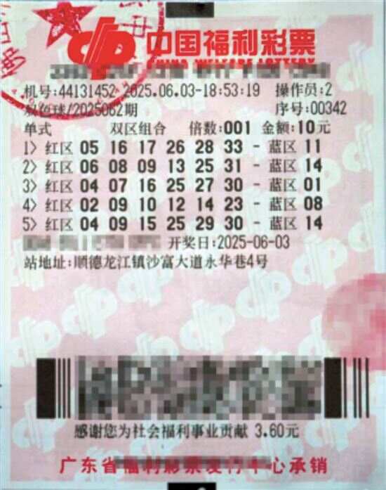 中国福利彩票双色球第2025062期开奖,当期全国共中出一等奖6注,其中1注花落佛山市顺德区44131452福彩销售站点。中奖彩票是一张1倍5注单式票,中得一等奖1注、六等奖1注,总奖金838万多元。